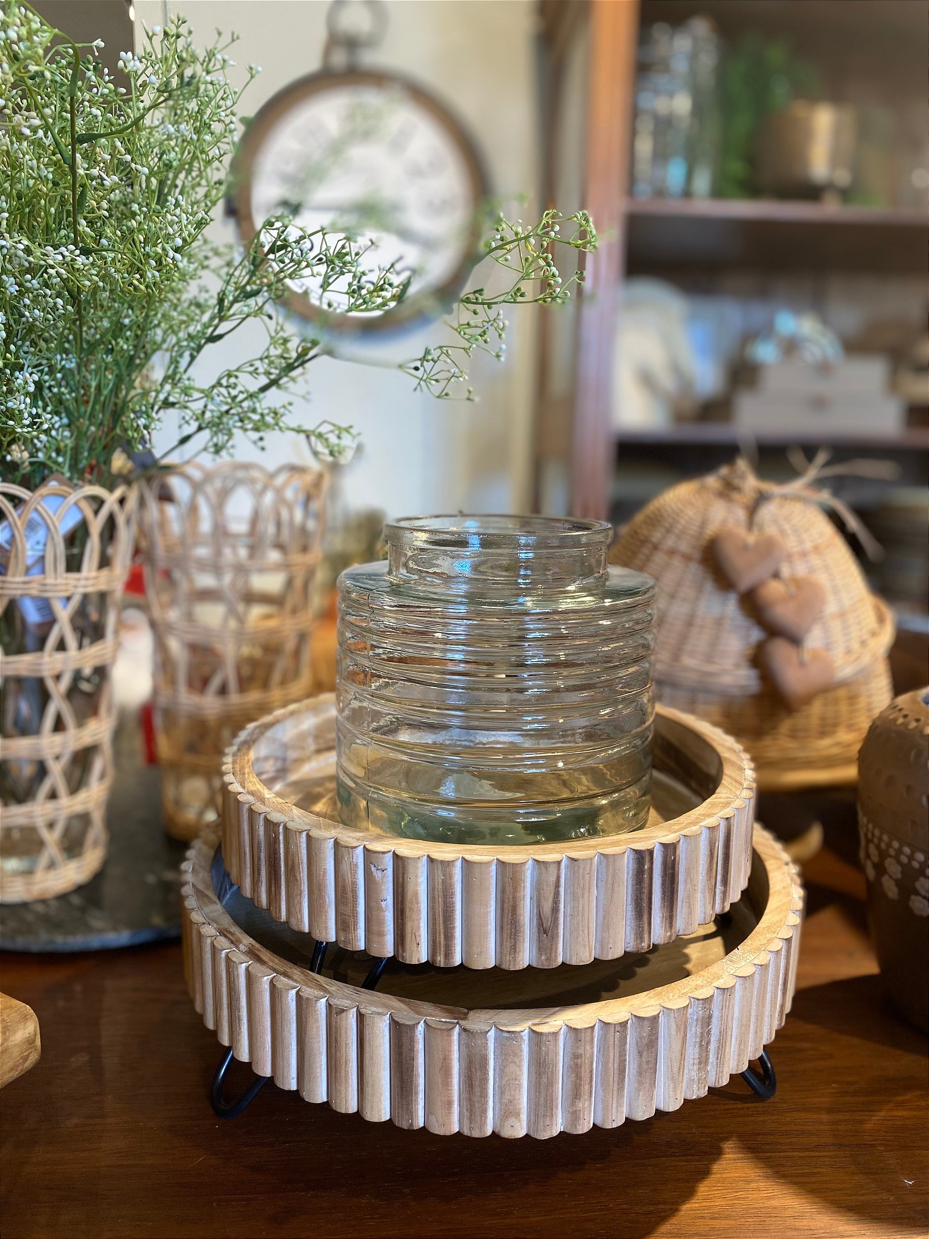 Bandeja de madeira redonda com pés em metal.